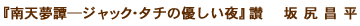 小津安二郎の無声喜劇に倣って、朗らかに歩め Marchez joyeusement! なんぞとなんの皮肉もぬきに宣言したくなってしまう。 2003年ジャック・タチの復活に巷が賑わう中、 現代音楽の俊英にしてタチ狂としても知られる伊左治直氏が、 親しい仲間たちとともにタチに捧げる心ときめくCDアルバム 『南天夢譚―ジャック・タチの優しい夜』を世に出した。 タチ映画の音楽が、ボサノバ調のアレンジとともに 新たな生命を吹き込まれ、よみがえる。なんという幸せ! タチ映画とともにわたしたちは、朗らかに歩むことを学ぶだろう。 そこにはつねにあの独特の音楽が楽しげに鳴り響いている。 作曲者は違えども同じような雰囲気を醸し出すタチ映画の音楽は、 一度聴いたら忘れることはできない。 それはことさら派手であったり華美であったりするものとはほど遠い。 タチの映画がつねにそうであるように至ってささやかなものである。 日々の暮らし、ヴァカンス、年に一度のお祭り、 周期的にくりかえされる退屈であったり、晴れやかであったり、 物憂くもあったりする人間とその世界の営み、 そうしたものすべてにたいする慈しみ、愛、讃嘆の気持ち。 いま、わたしたちは、タチ的音楽、音響にゆったりと身を委ねながら、 そこはかとなく浮遊し、浸透するその波動に、こわばりたわんでいた 心も体もゆるやかに解放されてくるのを感じることだろう。 伊左治直氏のアルバムは、まさにこうしたタチ的音楽、音響の性質を 知悉したうえで、新たな編曲、変奏、ヴォーカルによって、 タチ映画を聴く大いなる歓びへと人を誘惑する。 これは、音楽による伊左治氏の優れて魅惑的なタチ論である。 われわれはこのCDを、タチ映画がそうであるように、 くりかえし聴き直したいと思う。 短篇を含めた全長篇作品の音楽を網羅したこの画期的アルバムの魅力は、 タチ映画の実にさまざまな記憶を豊かに喚起されることにとどまらず、 タチ映画の不可視の余白にまでも 想像力の翼を飛翔させてくれることにある。伊左治氏のアルバムは、 タチ的音楽と音響が喚起する夢想の詩学の結晶と言ってよい。 われわれは、タチ映画から飛翔し、ふたたびタチ映画へと還り着く、 そんな往復運動をこのアルバムとともに、日々くりかえしてゆきたい。 このCDを聴きながら、そんなことを思うのだ。 これは、タチ映画と、われわれの世界と生の営みすべてに捧げられた、 素敵な贈り物である。 あの美しい『パラード』の行進曲とともに、朗らかに歩め! *文章および画像の無断掲載・転載等は固くお断りいたします。